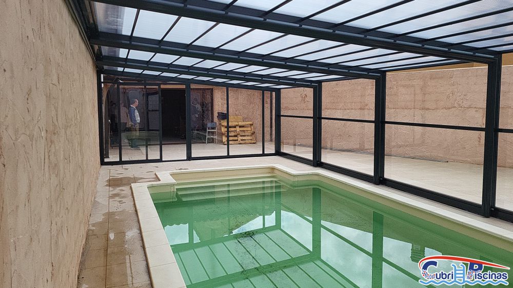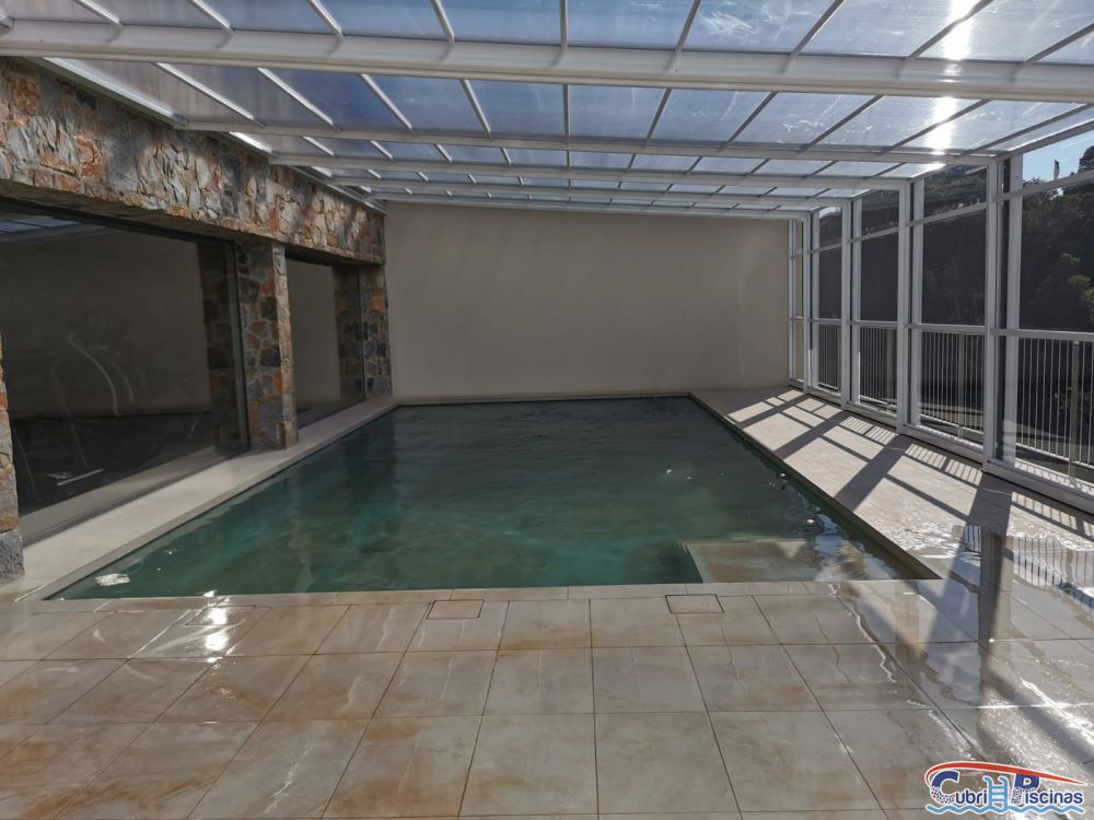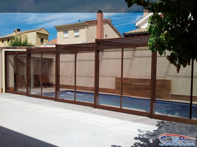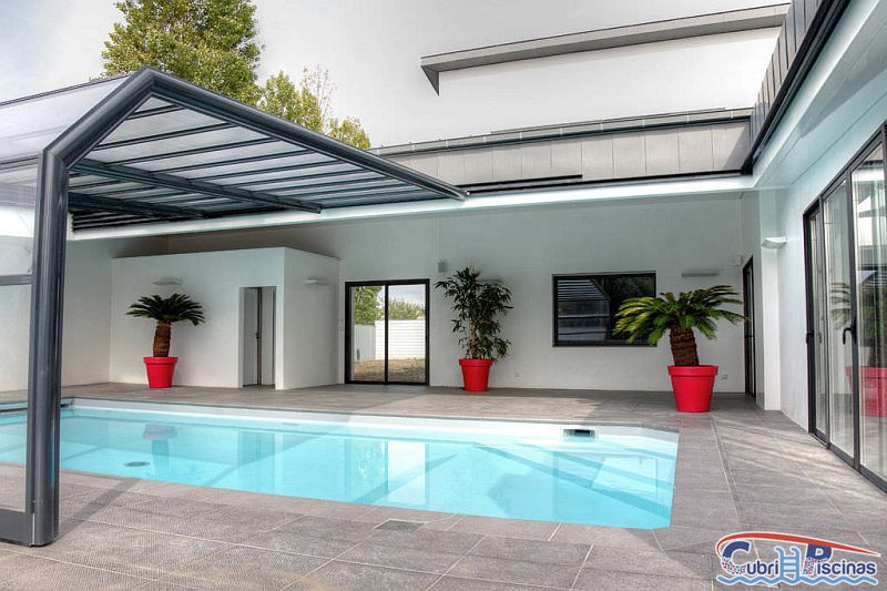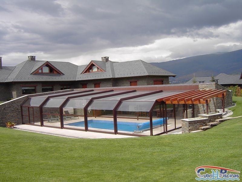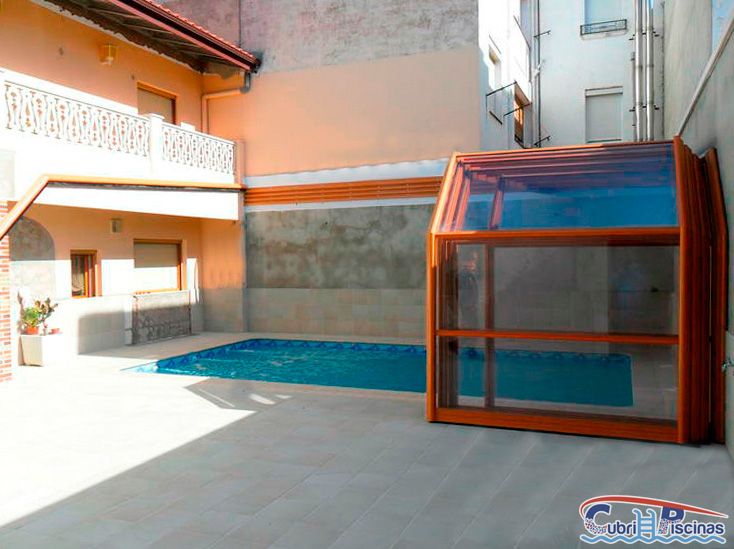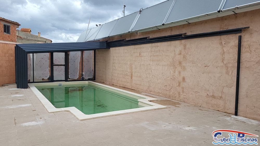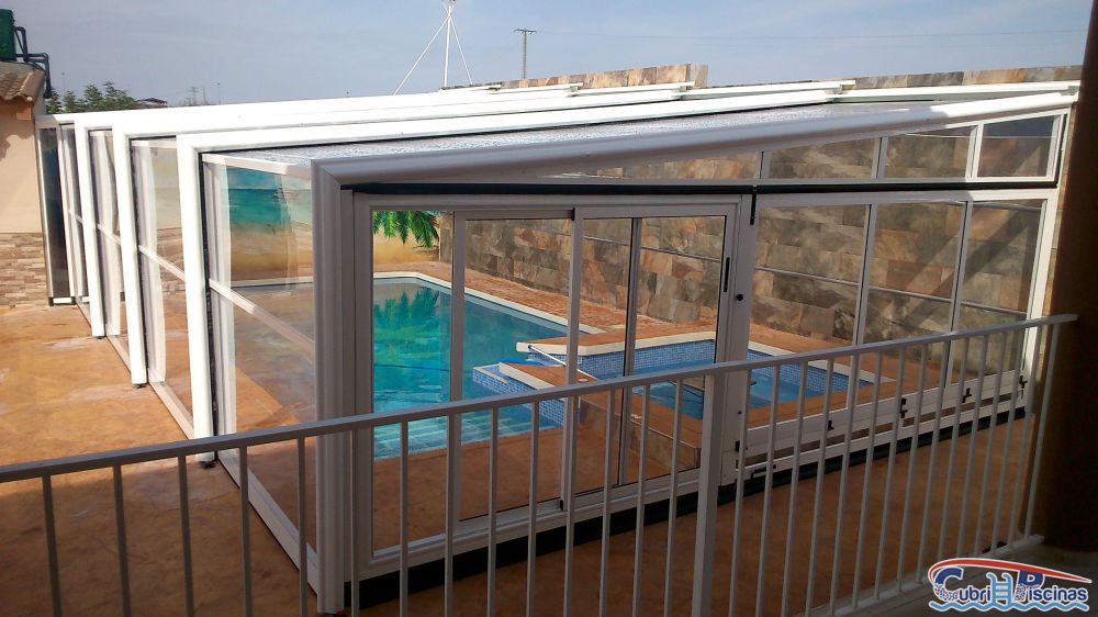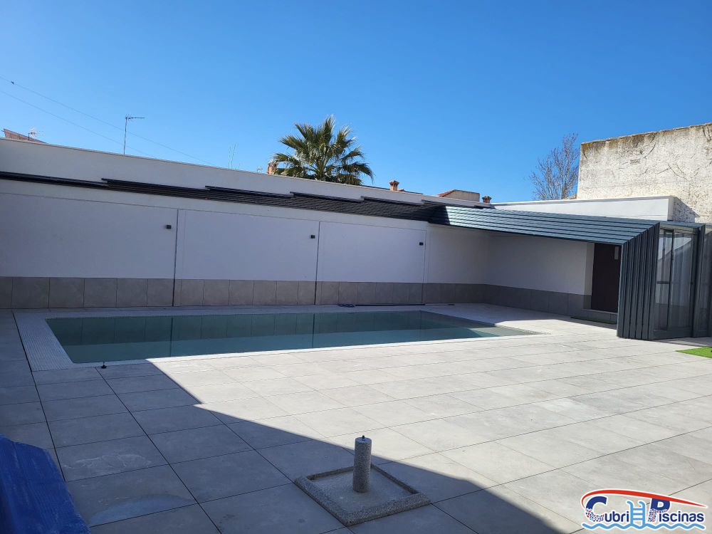 Al igual que las cubiertas para piscinas telescopicas simétricas, éstas adosadas una vez plegadas dejan un espacio en su interior donde se puede habilitar un práctico porche donde colocar mobiliario tipo cenador y así disfrutar de esa zona frente a la piscina.