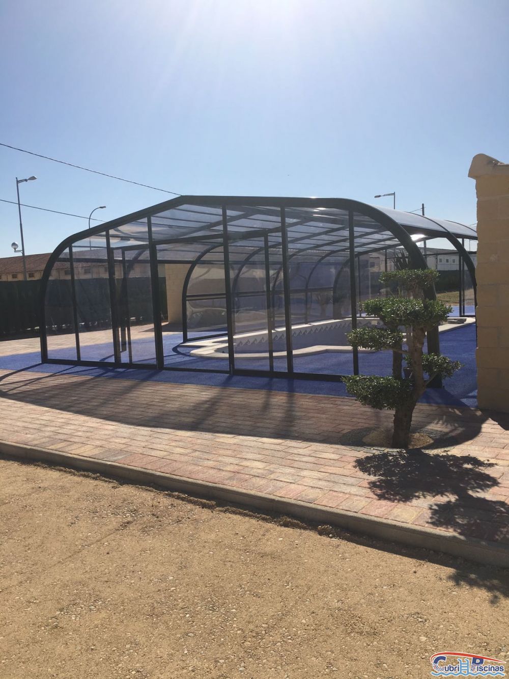 Acabada la instalación de otra cubierta de piscina en Albacete para añadir a los servicios que ofrecen las casas rurales a la hora de ofertar "Casa rural con piscina climatizada". Se trata de una cubierta alta del tipo fija con laterales de trampillas elevables hasta situarlas debajo del techo, dejando libre totalmente la zona de paso por ambos lados.
