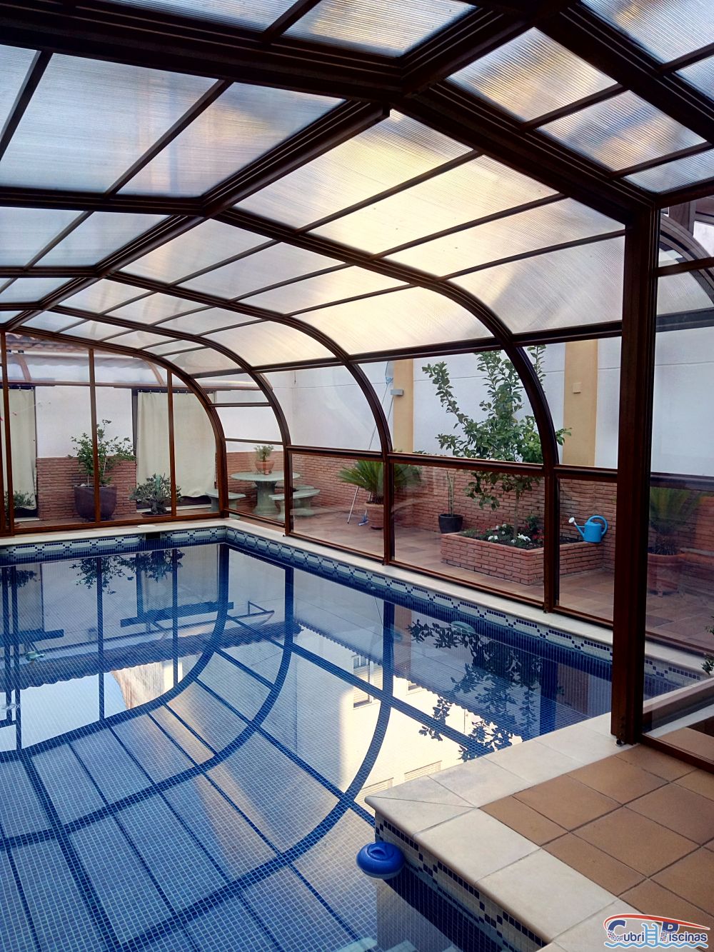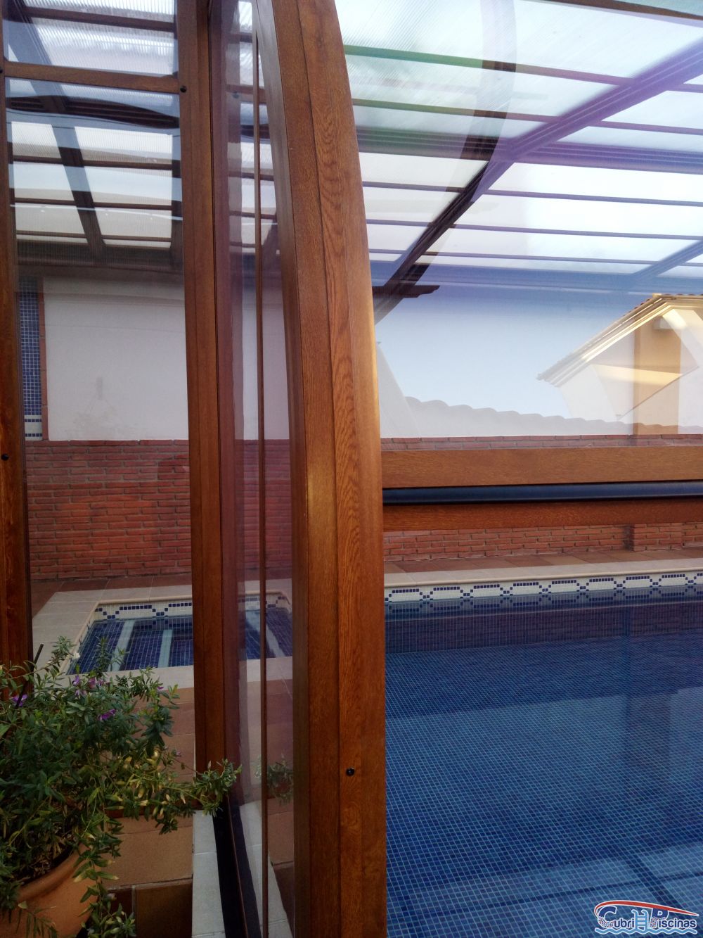 Debido a las características de ésta cubierta de piscina con la existencia de pared en fondo y lateral, adaptamos ésta estructura de Aluminio y Policarbonato lacado en madera veteada al sitio, como la solución más perfecta y adecuada para realizar éste proyecto, ofreciendo las máximas garantías de estanqueidad y evacuación de aguas pluviales a través de canalón a juego.
