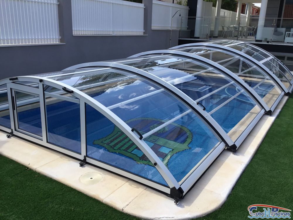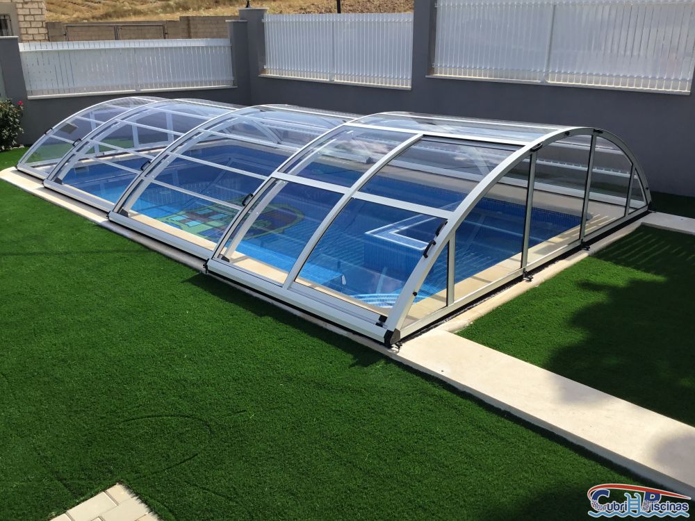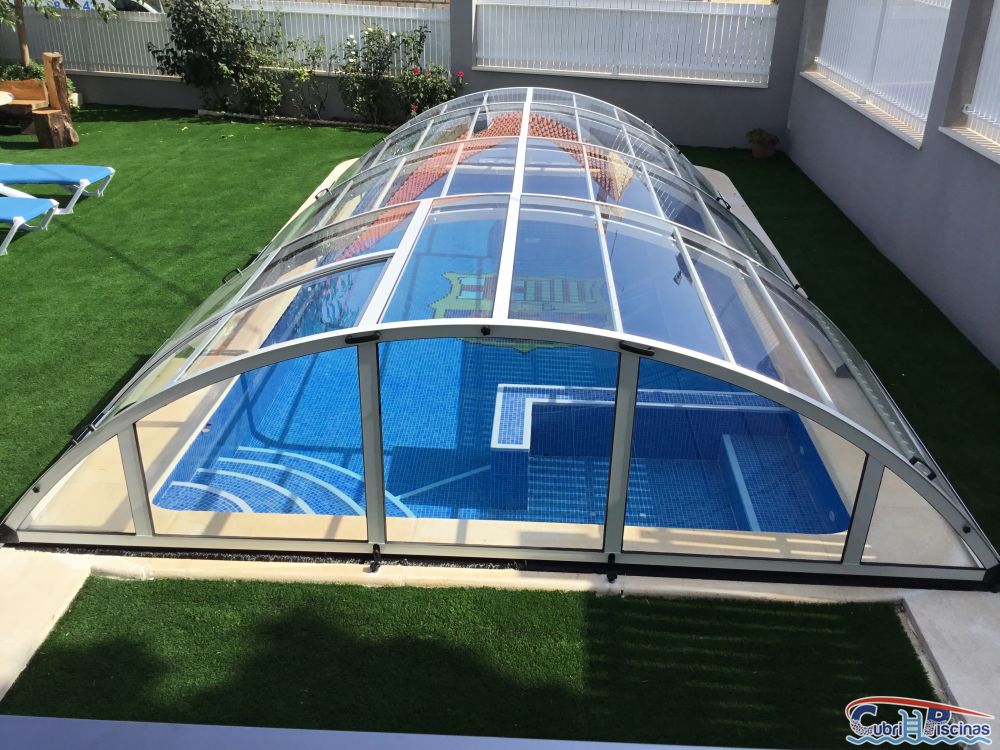 Reciente instalación de ésta cubierta de piscina baja totalmente transparente con puerta corredera lateral y otra en el fondo en color blanco. Calentará el agua de la piscina en unos 10º para ampliar la escasa temporada de baño en ésta zona fría de Murcia.