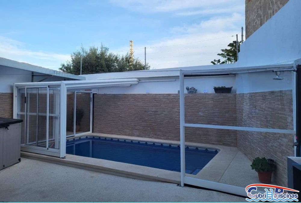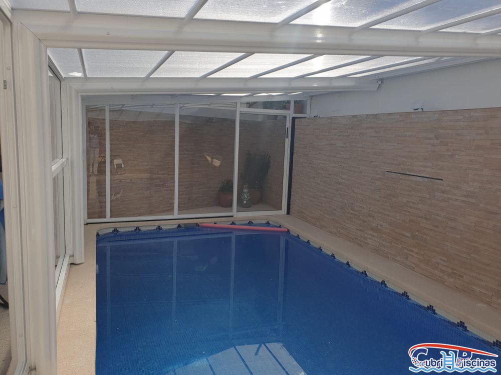 Cubripiscinas la ha fabricado en aluminio especial para éste tipo de cubiertas para piscinas con escuadras de aluminio macizo en todos sus ángulos, cerrada con policarbonato compacto transparente de 4 mm con protección UV en ambas caras en fondo y lateral de la cubierta de piscina, policarbonato celular de doble capa 6 mm con protección UV en ambas caras en los techos. Debido a las peculiares medidas del sitio, paredes desiguales con ángulos y descuadres, hemos colocado ésta cubierta telescópica adosada quedando perfectamente integrada en el sitio y con el cliente completamente satisfecho, porque climatizando la piscina de las inclemencias del tiempo en un pueblo como el de Albacete, puede seguir utilizando su piscina durante todo el año.